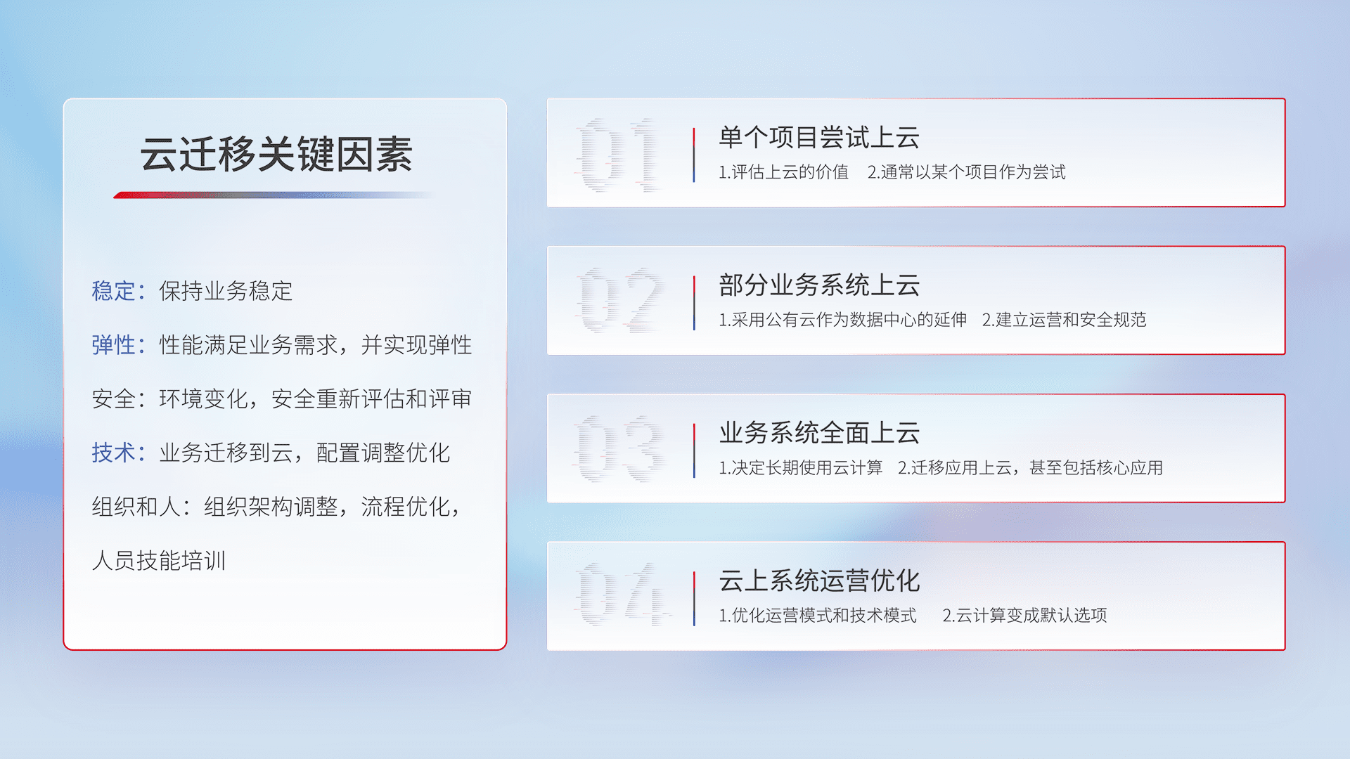 结合实际业务,,,,从规划设计、、云平台选型、、云原生改造、、数据迁移、、、集成交付,,,,迁移全过程为客户识别最佳上云路径,,做好风险识别管理,,设计网络架构、、身份权限、、、安全审计合规、、、操作审计、、、日志审计、、监控告警策略、、、、多站点容灾设计等,,对云上基础设施进行整体规划,,,,提升IT治理水平,,,以满足弹性、、、、高可用、、高性能的需求。。。。