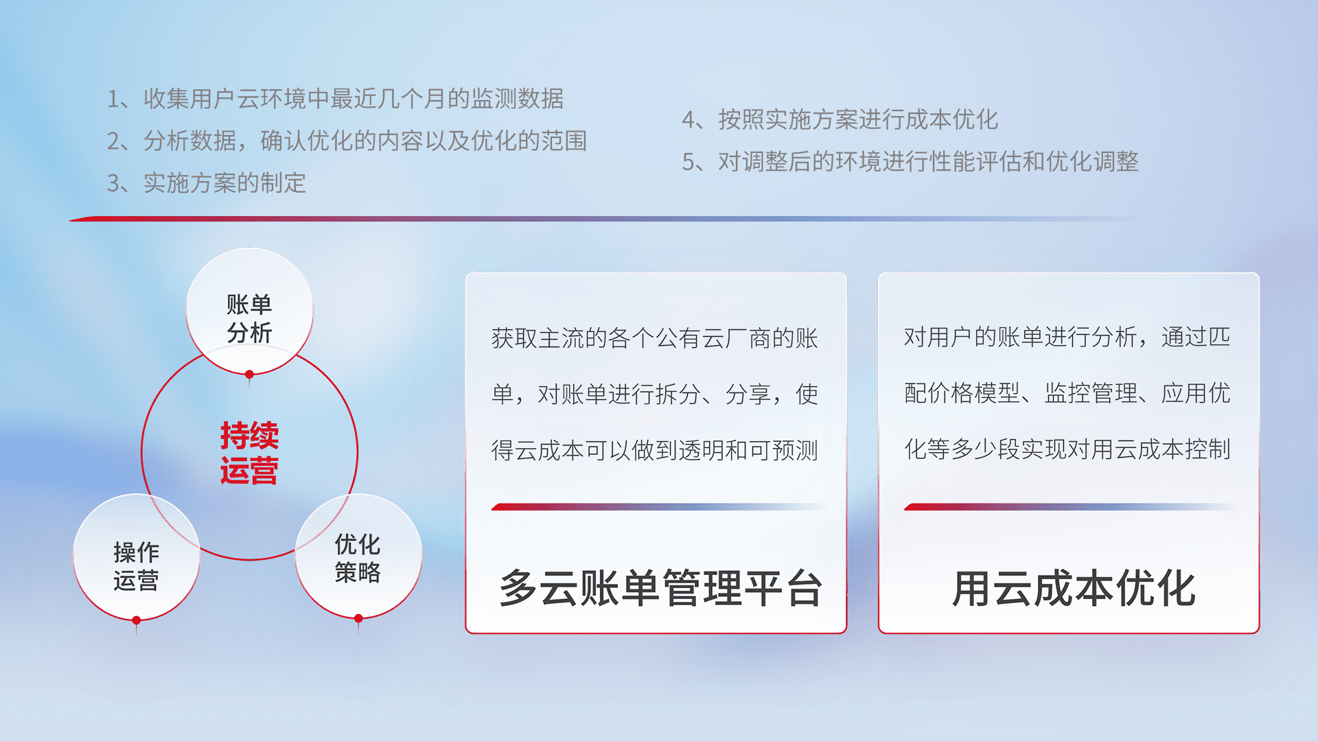 通过多云纳管,,以统一的资源数据模型把客户的云资源进行抽象和封装,,,进而实现对多云资源的统一操作,,,,保障云资源管理的可靠性、、、稳定性与可用性。。。量身定制化运维内容,,配置、、、开发运维、、补丁管理、、、、备份、、、监控、、认证和访问管理、、、、审计和日常巡检等,,保障在用云过程中的可靠度,,,,稳定度以及高可用率。。。